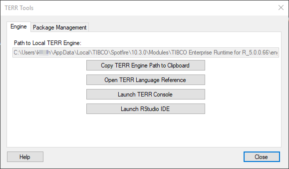 The TERR Tools Engine dialog provides direct access and information to the TIBCO® Enterprise Runtime for R (TERR) engine installed with your Spotfire installation. You can find help for using the libraries included in TERR, test your TERR scripts by launching the TERR engine in a separate window, or write and test scripts and data functions using RStudio.