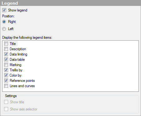 Specifies what will be shown in the legend. By clearing a check box you will completely hide that item from the legend. You can also select to show or hide parts of the legend information using the check boxes under Settings for the selected item in the list, see below. |