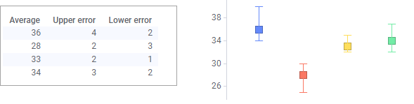 The other way to define error bars is to use the values in existing data table columns. You may, for example, have a data table where average values and error values have already been calculated, as in the table below. You can then use these columns to set up the error bars. In the scatter plot below, the Y-axis represents the column Average, and the upper and lower errors represent the two columns Upper Error and Lower Error respectively.