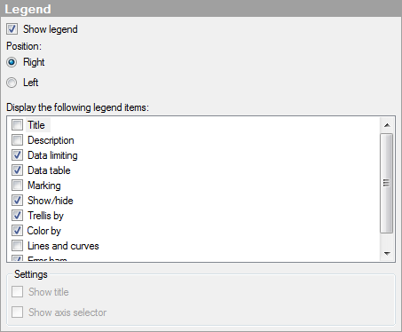 By clearing a check box you will completely hide that item from the legend. You can also select to show or hide parts of the legend information using the check boxes under Settings for the selected item in the list, see below.