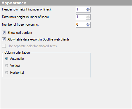 Specifies the height of the header row in number of lines. Tip: You can also change the header row height directly in the details-on-demand table by clicking and dragging the divider below the header row to the desired height. |