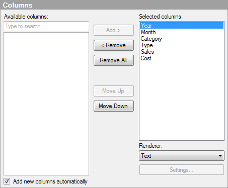 Removes the selected columns from the Selected columns list and sends them back to the Available columns list.