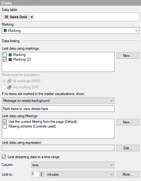 Lists the available markings that can be used to limit what is shown in the visualization. This means that the visualization only shows data that has been marked in other visualizations or has been marked within the visualization itself (master visualizations).