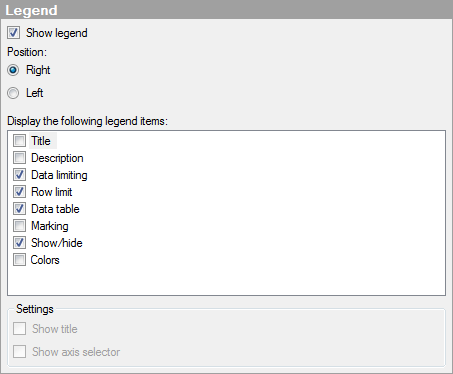 Specifies what will be shown in the legend. By clearing a check box you will completely hide that item from the legend. You can also select to show or hide parts of the legend information using the check boxes under Settings for the selected item in the list, see below. |