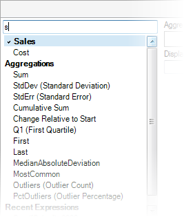 When you start typing in the search field of a column selector, all columns containing the entered letters will be listed in the selector. You will also get a list of aggregation methods and/or any recent expressions where the entered letters are included: