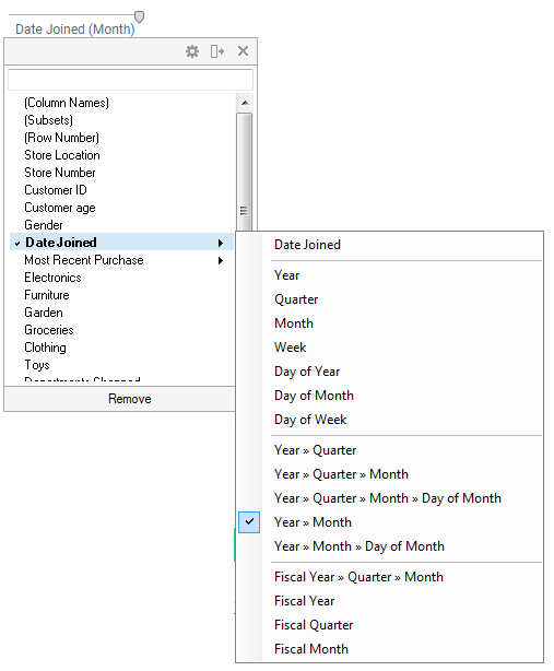 When you are working with time-series data (Date, Time, DateTime or TimeSpan columns), you can, from the column selector, set up a hierarchical structure directly. You simply select the time-series column in the column selector menu, and in the menu that opens to the right, select the hierarchical structure of your choice. The hierarchy slider, allowing you to quickly change the time resolution, will be shown immediately.
