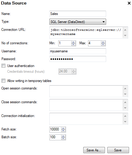 Use individual usernames to authenticate users when running information links. By default, this will prompt the user for credentials when running the information link against this data source for the first time. Optionally, you can develop a custom plug-in and use it to retrieve the credentials. Note: If you are using Kerberos Delegation for database connections be sure to select this check box. Note: When using a data source with user authentication the database administrator needs to make sure that all users has sufficient privileges to create, truncate and drop the temporary tables in the data source. |
