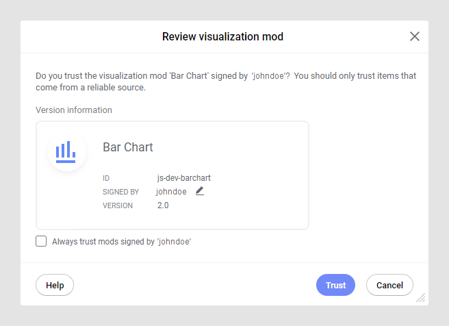 For security reasons, the Review visualization mod dialog is shown if you try to add a visualization mod that has not been trusted before. If you have the appropriate permissions, you can make the decision to trust the mod yourself.