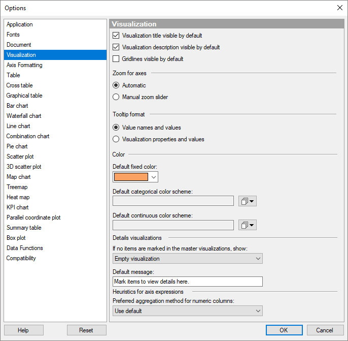 Select what details visualizations should show when no items have been marked in their master visualizations. Comment: Since different visualization types have different available attributes, it varies between visualization types exactly what will be shown using the available alternatives. For example, some visualizations do not display axis selectors, and others do not display scales. The help section for the Data page of the Visualization Properties describes the specifics for each visualization type. |