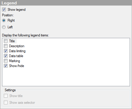 Specifies what will be shown in the legend. By clearing a check box you will completely hide that item from the legend. You can also select to show or hide parts of the legend information using the check boxes under Settings for the selected item in the list, see below. |