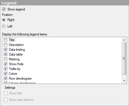Specifies what will be shown in the legend. By clearing a check box you will completely hide that item from the legend. You can also select to show or hide parts of the legend information using the check boxes under Settings for the selected item in the list, see below. |