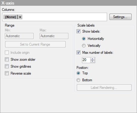 [Only available when the selected column only can be categorical. For example, if the selected column is a string column or a binary column.] Opens the Label Rendering dialog where you can change the rendering method of the axis labels from text to images in applicable cases. |