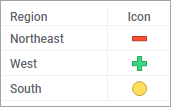 Icons are small, simple images traditionally used for displaying trends or variations of some variable. They can be displayed in the context of a graphical table or, separately, in a text area. In the example below, the icons are used in a graphical table to show the bottom, top, and intermediate sales region of some fictive product: