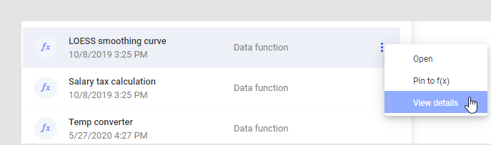 When hovering with the mouse pointer over a data function in the f(x) flyout, or when browsing the library using the Files and data flyout, you will see a menu next to the data function where you can select View details to see more information.