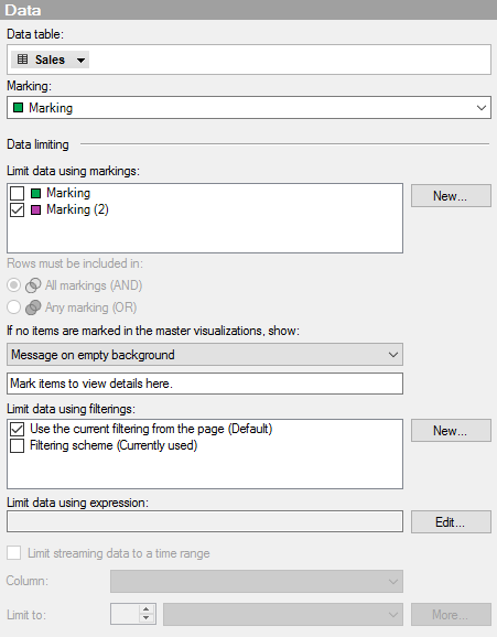 Lists the available markings that can be used to limit what is shown in the visualization. This means that the visualization only shows data that has been marked in other visualizations or has been marked within the visualization itself (master visualizations). If more than one marking is selected, you can choose how the data in the markings should be combined. Tip: You can specify what should be shown in the visualization if no items have been marked in the master visualizations. See the If no items are marked in the master visualizations, show drop-down list below. To be able to mark data, and show it within the visualization itself, the All data option should be selected in this list. See What is a Details Visualization? to learn more about how you can use master-details visualizations to drill down into your data. |