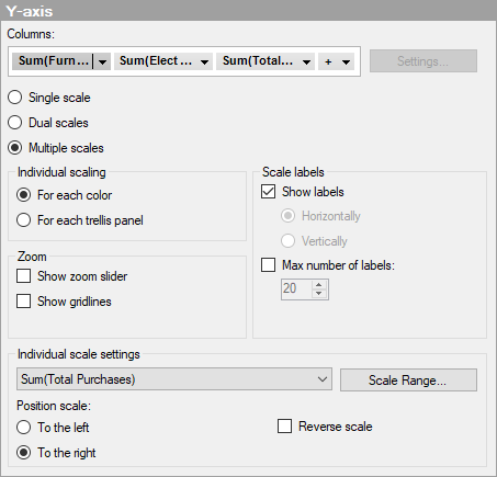 Select this option to show more than two scales on the Y-axis. By default, you get one scale for each color that is defined on the Series by axis, and the different scales can be displayed on the left as well as the right side in the visualization. For example, use this option if you want to display several measures of very different magnitudes in the same visualization. |