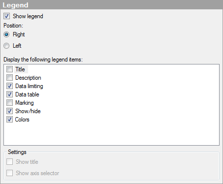 By clearing a check box you will completely hide that item from the legend. You can also select to show or hide parts of the legend information using the check boxes under Settings for the selected item in the list, see below.