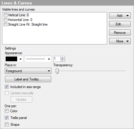 Some of the visualization types can display additional information in reference lines or several different types of curves. This is set up in the properties dialog of each appropriate visualization type. Here, the Lines and Curves page of the scatter plot properties is shown: