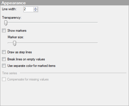 Drag the slider to change the transparency of the lines. This can be useful if you want to be able to see lines or curves placed in the background more clearly, or if the line chart contains many lines which are drawn on top of each other. |
