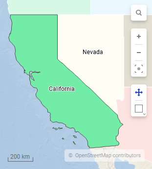 More details may become visible when you zoom in the map, and you also have the option to specify at which zoom level a certain layer should become visible. See Map Chart Properties – Zoom Visibility for more information. You can zoom and pan in a map using the navigation controls to the right of the map. Click the small icon with an arrow on the map chart title bar (shown on mouse over) to show or hide the navigation controls. To learn more about zooming and panning, see Zooming and Interacting in the Map Chart.