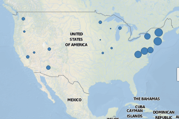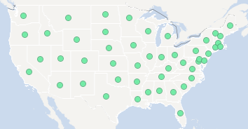In a marker layer, markers or pies are positioned in the different areas. In the example below, the map shows the same geographical area as in the first example, and is also divided into states. But instead of the states being interactive, a marker is placed in each of the states, and you can interact with the markers just as you do with markers in other visualizations.