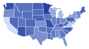 Feature layers contain map features or shapes of the type polygon, line, or point. A feature layer can be used either as a data layer or as a reference layer only displaying items of visual interest. Below is an example of a map chart with an interactive feature layer showing shapes, where each shape represents a state in the United States. Each shape in the map is a separate item, and you can interact with those items the same way you do with items in any other visualization.