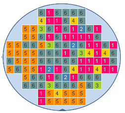 A map chart can be used to show other than geographical data. The example below displays different types of failures on a wafer, a semi-conductor material used to manufacture microchips.
