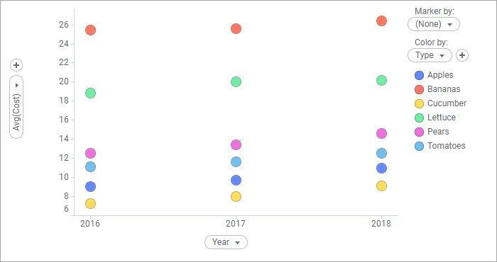 If you start slicing the data into smaller parts, the result could look like the example below, where each marker represents the sum of the sales for each product for each year.