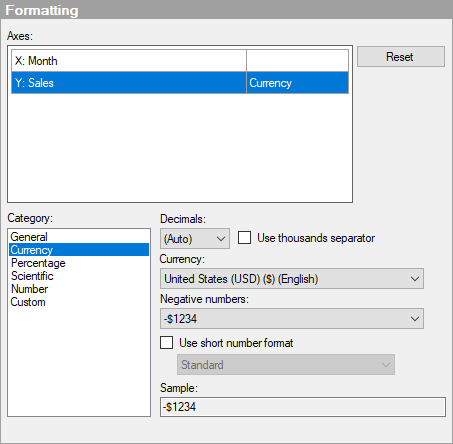 Lists the available formatting categories for the selected axis. Each category in this list has separate settings. Which categories are available depends on the data type of the selected axis. See Formatting Settings for a full description of all possible options. |