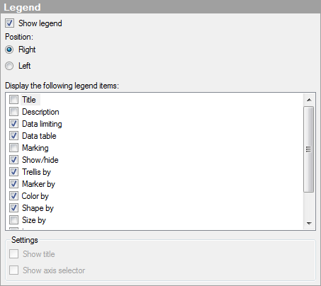 Specifies what will be shown in the legend. By clearing a check box you will completely hide that item from the legend. You can also select to show or hide parts of the legend information using the check boxes under Settings for the selected item in the list, see below. |