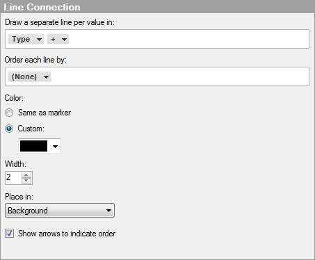 Specifies the column or hierarchy containing the categories to use for line connection. Markers of the same category will be connected with each other to form a separate line. If no column or hierarchy is specified here, all markers will be connected with each other. |