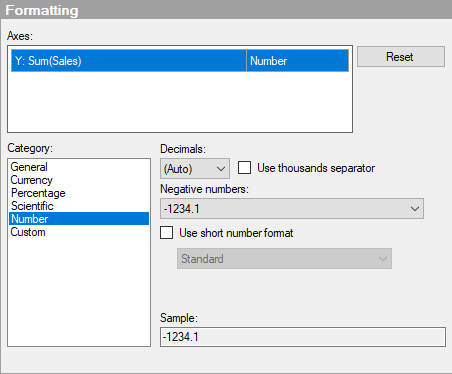 Resets the formatting for the selected axis values according to the settings defined on column level. If no column formatting has been set, axis formatting settings defined in the Options dialog will be used. If no settings have been specified in the Options dialog, the default settings for the visualization type will be used.