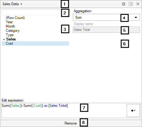 Allows you to specify a display name to use instead of the current expression. Note: If you are manually editing the expression the display name field will be unavailable until you click Apply in the Edit expression field. |