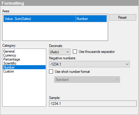 Lists the available formatting categories for the selected axis. Each category in this list has separate settings. Which categories are available depends on the data type of the selected axis. See Formatting Settings for a full description of all possible options. |