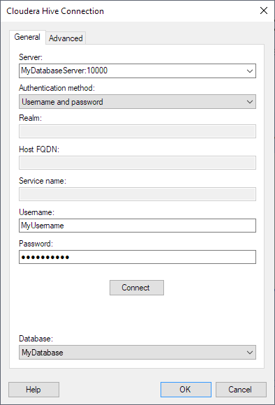 This dialog is used to configure a connection to a Cloudera Hive database. You can choose whether to analyze data in-database or to import it into your analysis. Note that you need to install a driver on your computer to get access to the Cloudera Hive connector. See the system requirements at http://spotfi.re/sr/connectors to find the correct driver. You can also view Getting Started with Connectors to learn more about getting access to connectors in Spotfire.