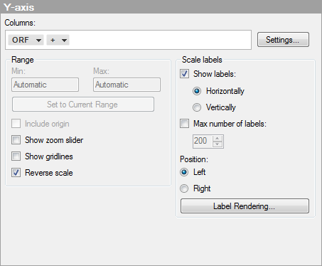 [Only available when the selected column only can be categorical. For example, if the selected column is a string column or a binary column.] Opens the Label Rendering dialog where you can change the rendering method of the axis labels from text to images in applicable cases. |