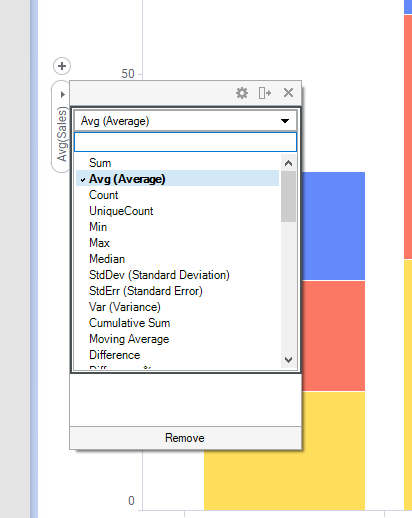 To specify how the data in the column you have selected should be summarized, you select an aggregation method on the column selector. In this example, the Sales values are summarized into an average.