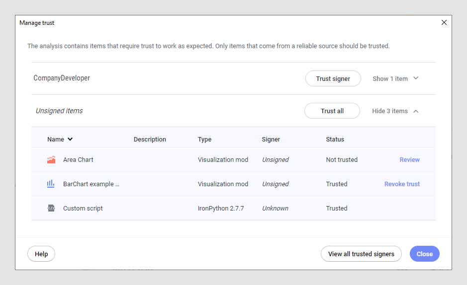 Spotfire scripts and data functions do not support signing, so those items are always shown under Unsigned items in the Manage trust dialog. Instead, Spotfire uses a trust mechanism, where users called Script Authors, verified by licenses and group membership, are the only ones that can make a script trusted for anyone in the organization.