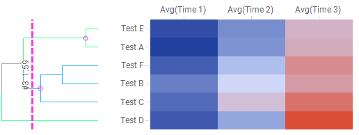 Hierarchical clustering arranges items in a hierarchy with a treelike structure based on the distance or similarity between them. The graphical representation of the resulting hierarchy is a tree-structured graph called a dendrogram. In Spotfire, hierarchical clustering and dendrograms are strongly connected to heat map visualizations. You can cluster both rows and columns in the heat map. Row dendrograms show the distance or similarity between rows, and which nodes each row belongs to as a result of clustering. Column dendrograms show the distance or similarity between the variables (the selected cell value columns). The example below shows a heat map with a row dendrogram.