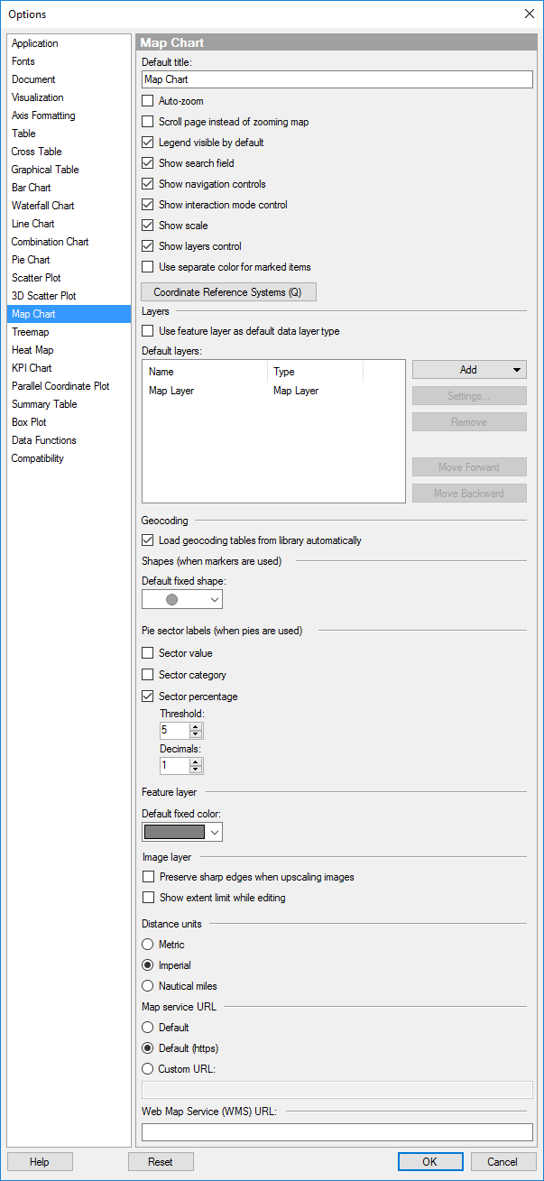 Opens the Coordinate Reference Systems dialog where you can specify the default coordinate reference systems for the map chart, and the layers. |