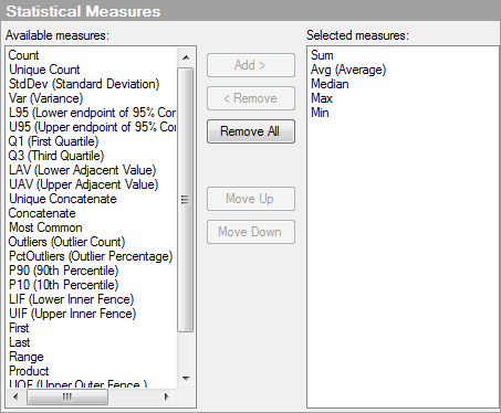 Moves the selected measures up in the Selected measures list. The order of the measures in this list determines the order of the measures in the table. |