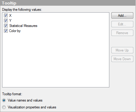 Opens the Add Tooltip Value dialog, where you can add the content from another column, hierarchy, or any custom expression to be shown in the tooltip. You can also use images in tooltips. See Highlighting in Visualizations for more information. Note: Custom tooltip values are only displayed for outliers in a box plot, not for the boxes themselves. |