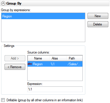 The Group by section is only important if you have specified some type of aggregation in the Expression field at the top of the page. When an aggregation has been defined, you can select the categories to group by here. See Using Aggregation in Information Designer for more information.