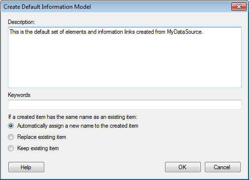This dialog allows you to specify a description and keywords for all elements created by the Create Default Information Model menu option. This type of information can be used to identify all elements created by this operation at a later stage. It also lets you specify how to handle any name conflicts with existing elements.