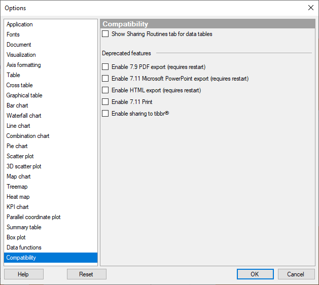 In TIBCO Spotfire 7.12, the export to Microsoft PowerPoint function was renewed. However, the 7.11 version of the export function can still be accessed. Select this check box, and the File > Export > To Microsoft PowerPoint - 7.11 version [Deprecated] menu option becomes activated after restart. |