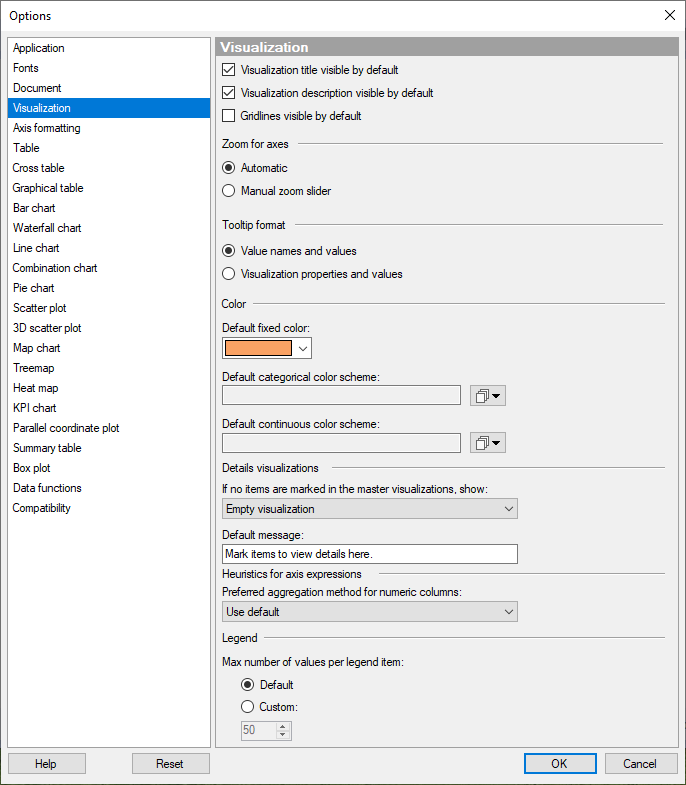 Select what details visualizations should show when no items have been marked in their master visualizations. Comment: Since different visualization types have different available attributes, it varies between visualization types exactly what will be shown using the available alternatives. For example, some visualizations do not display axis selectors, and others do not display scales. The help section for the Data page of the Visualization Properties describes the specifics for each visualization type. |