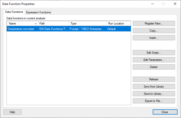 Makes the document use an updated version of the function definition if a newer version is available in the library. Note: Synchronizing is possible only for data functions that have been saved to the library and added from the library. The Sync from Library button is unavailable for unsaved data functions run from the Register Data Functions dialog. If the analysis is expected to have a long life span, it is recommended to keep only saved data functions in the analysis, so that they can be updated. |