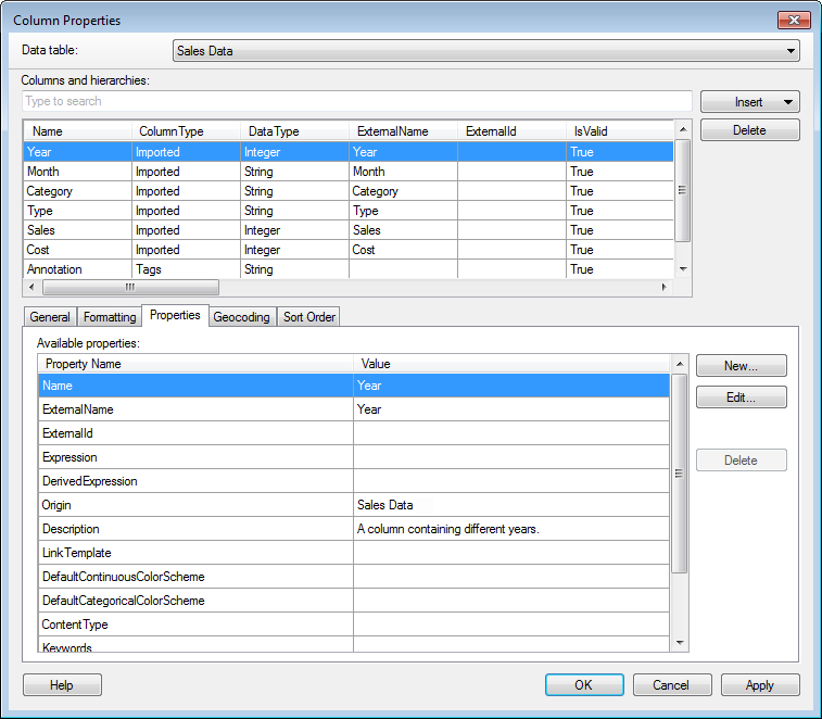 Opens the New Property dialog, where custom column properties can be defined. Custom column properties are added to all columns in the analysis, including those in other data tables. |
