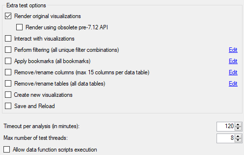 Allows you to set the test option to run all or a limited number (e.g., filters, bookmarks, columns and data tables). |