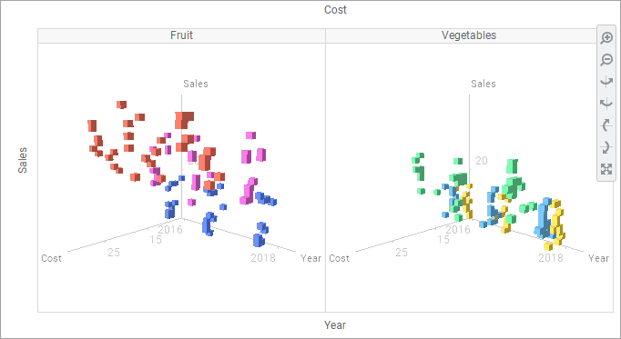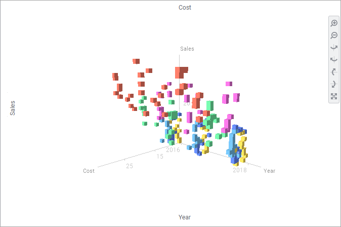 In the 3D scatter plot below, sales, cost, and year are plotted against each other for a number of different products (colored by product).